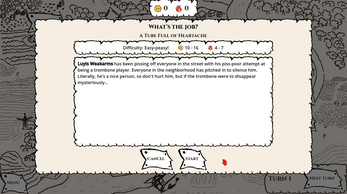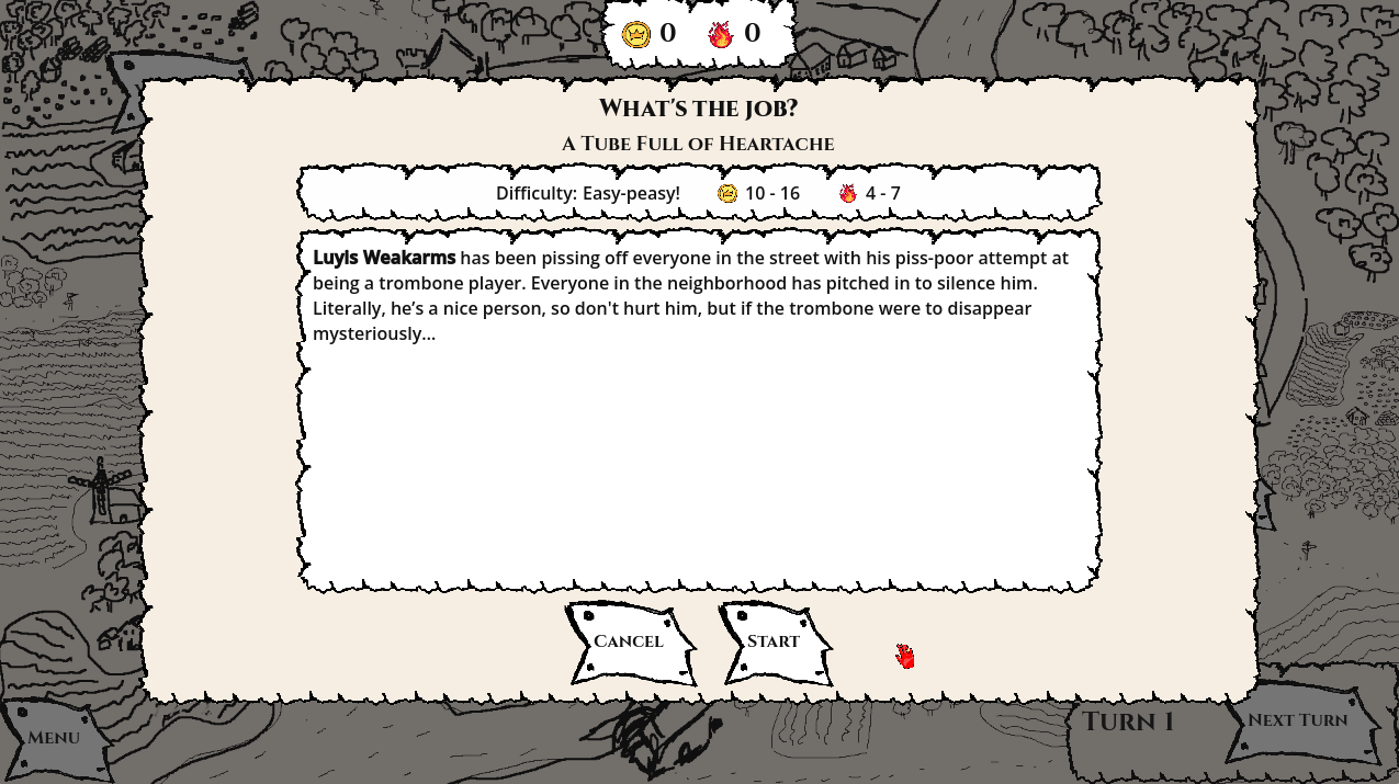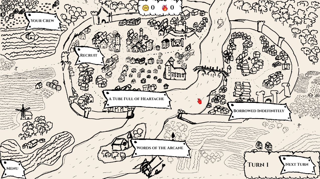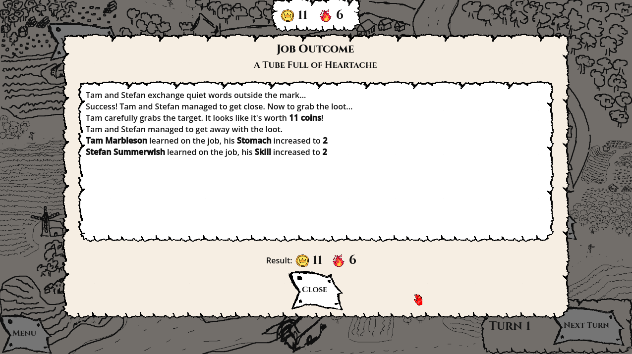 You and your three old pals decided to set up a proper thieves guild, the first one in the city. Will you get rich beyond measure, or will you fumble spectacularly and stay poor? Work your way up in 10 turns, ranging from petty theft to high politics. Work with an ancient lich, a scheming nobleman or a bridge troll, among others. And most importantly, take care of your crew, and have fun!